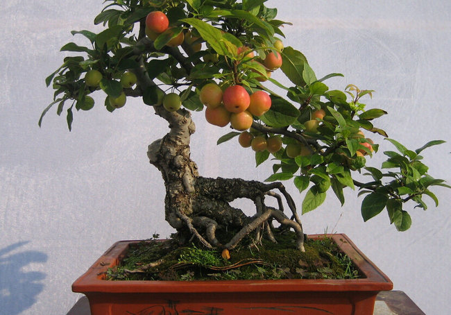盆栽果樹,可根據(jù)個(gè)人的愛好修剪成盆景樹形,注意角度開張,使之通風(fēng)透光,利于形成花芽,獲得高產(chǎn)。盆栽蘋果控制樹冠要從1年生苗起,以干高相當(dāng)于盆體高度或高出盆體一倍為宜,采用盤繞式拉枝方式,抑制長勢(shì),促使發(fā)枝。也可對(duì)1年生苗木按所需高度進(jìn)行摘心,促壯主干,再發(fā)新枝。對(duì)新發(fā)枝應(yīng)拉枝培養(yǎng)樹形;對(duì)徒長枝、競(jìng)爭枝,在枝條的5~7片葉間進(jìn)行扭梢,可有效控制樹體高度,防止徒長,促成花芽;對(duì)生長旺的徒長枝和競(jìng)爭校要充分利用,結(jié)合拉枝進(jìn)行扭梢、摘心、刻傷、環(huán)剝,可培養(yǎng)大量結(jié)果枝,并促使其形成花芽,達(dá)到早結(jié)果、多結(jié)果的目的。當(dāng)盆栽蘋果進(jìn)入結(jié)果期時(shí),樹形已基本確立,要根據(jù)品種合理選留枝條,以整個(gè)樹冠空間占滿、得到合理利用為宜,有空間的長枝可留作培養(yǎng)新骨架,中、短枝培養(yǎng)為結(jié)果枝組,使樹冠保持穩(wěn)定,做到長短枝相間,葉果比適宜。